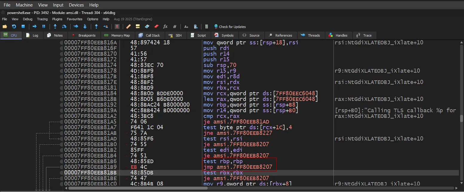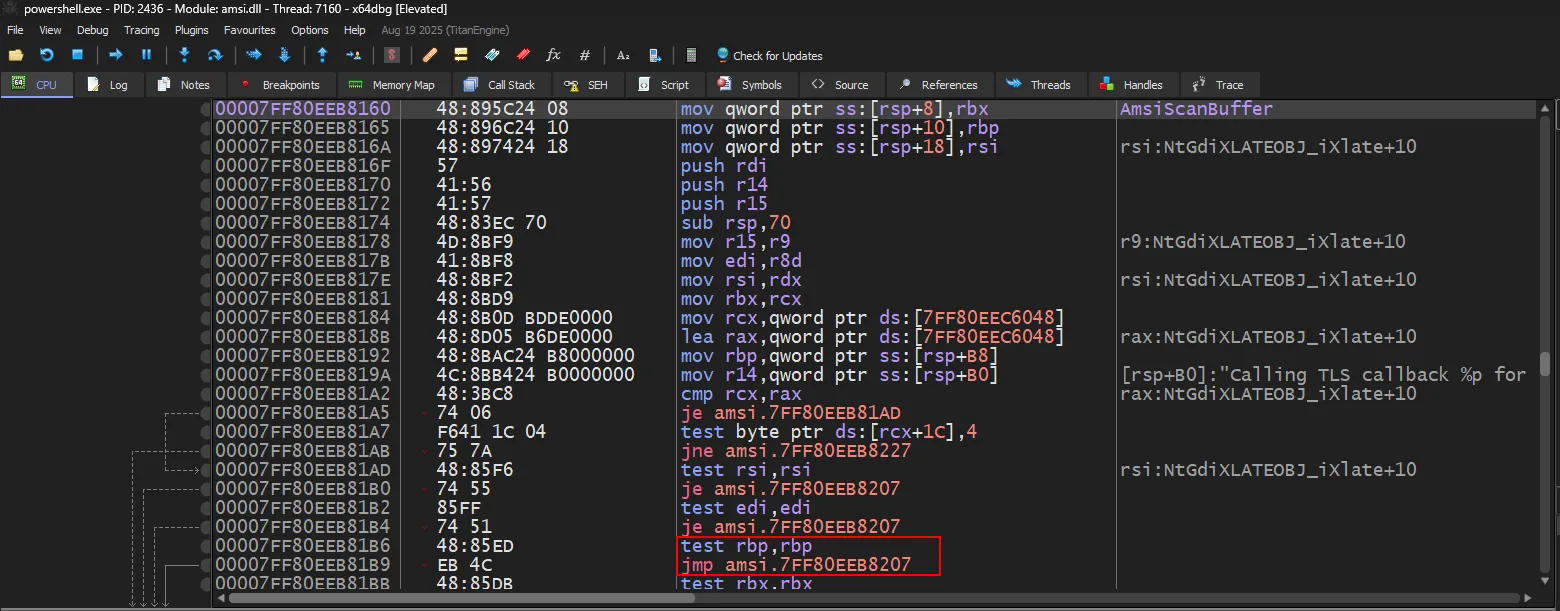 I also attached x64dbg to the PowerShell process (PID: 2436) where I executed the AMSI bypass POC executable to verify if the je instruction got patched to jmp, and you can see that it was indeed successfully patched.