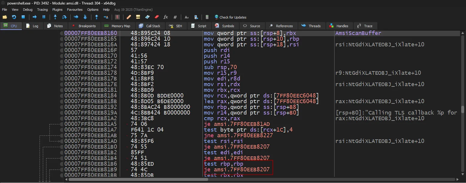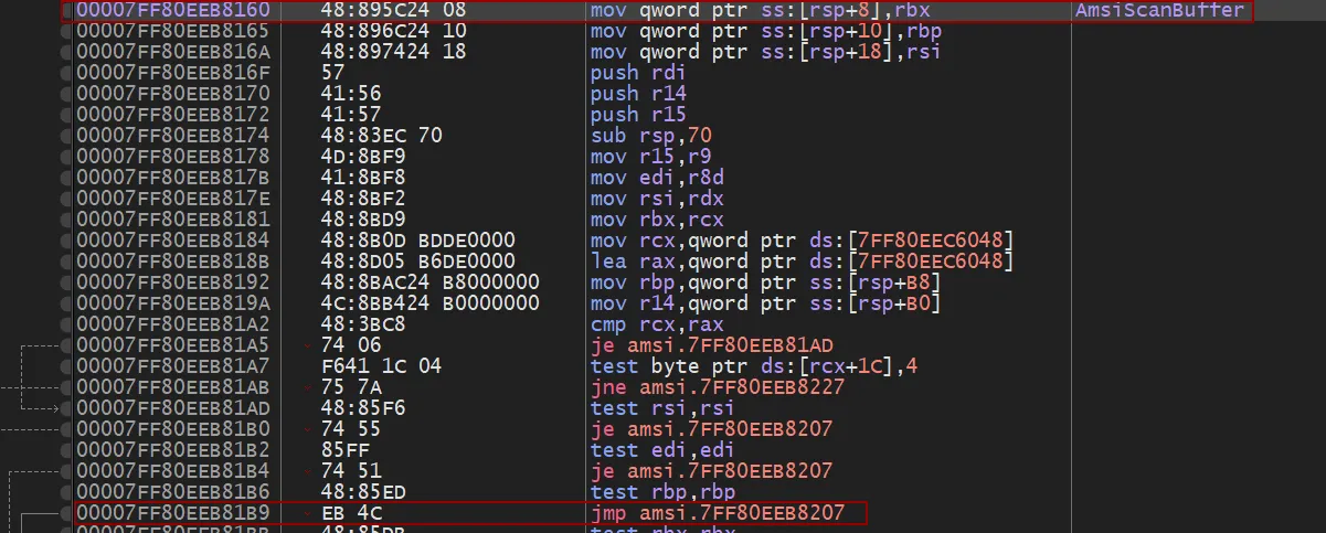 As shown in the image above, the je instruction is located at offset 0x59 from the AmsiScanBuffer() function’s starting address.