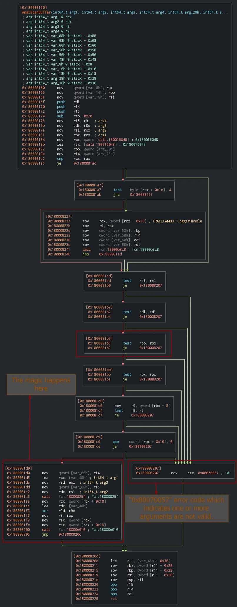 Throughout the AmsiScanBuffer() function, there are multiple conditional jump instructions je - jump if equal that are triggered when invalid arguments are detected. These jumps redirect the execution flow to the error-handling code block.