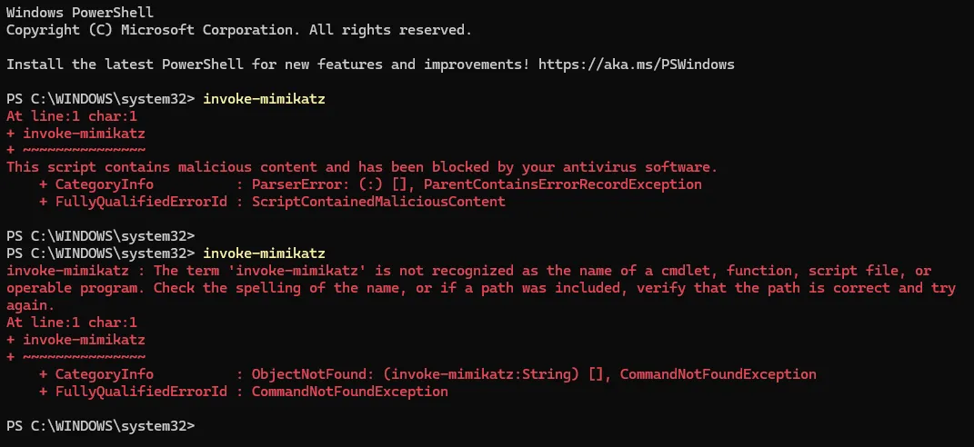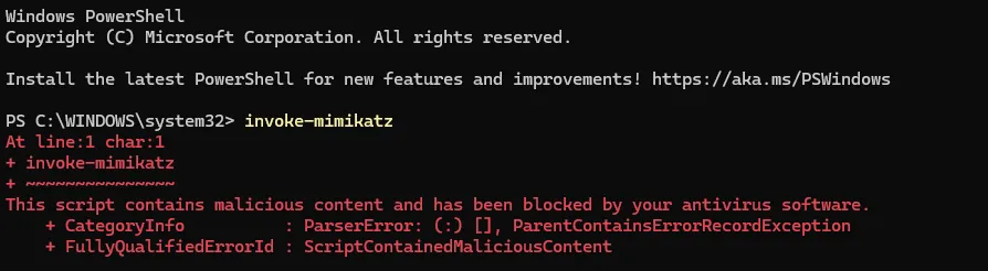 After applying the patch, I pressed F9 (Run) to continue execution and then detached x64dbg from the PowerShell process. Now when typing invoke-mimikatz in PowerShell, you can see it is no longer being detected 😎.