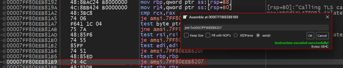 Our patching strategy: By changing one of these conditional jumps, je to an unconditional jump jmp, we can force the function to always jump to the error block. This allows us to bypass AMSI checks by forcing the function to consistently return an error, effectively bypassing it.